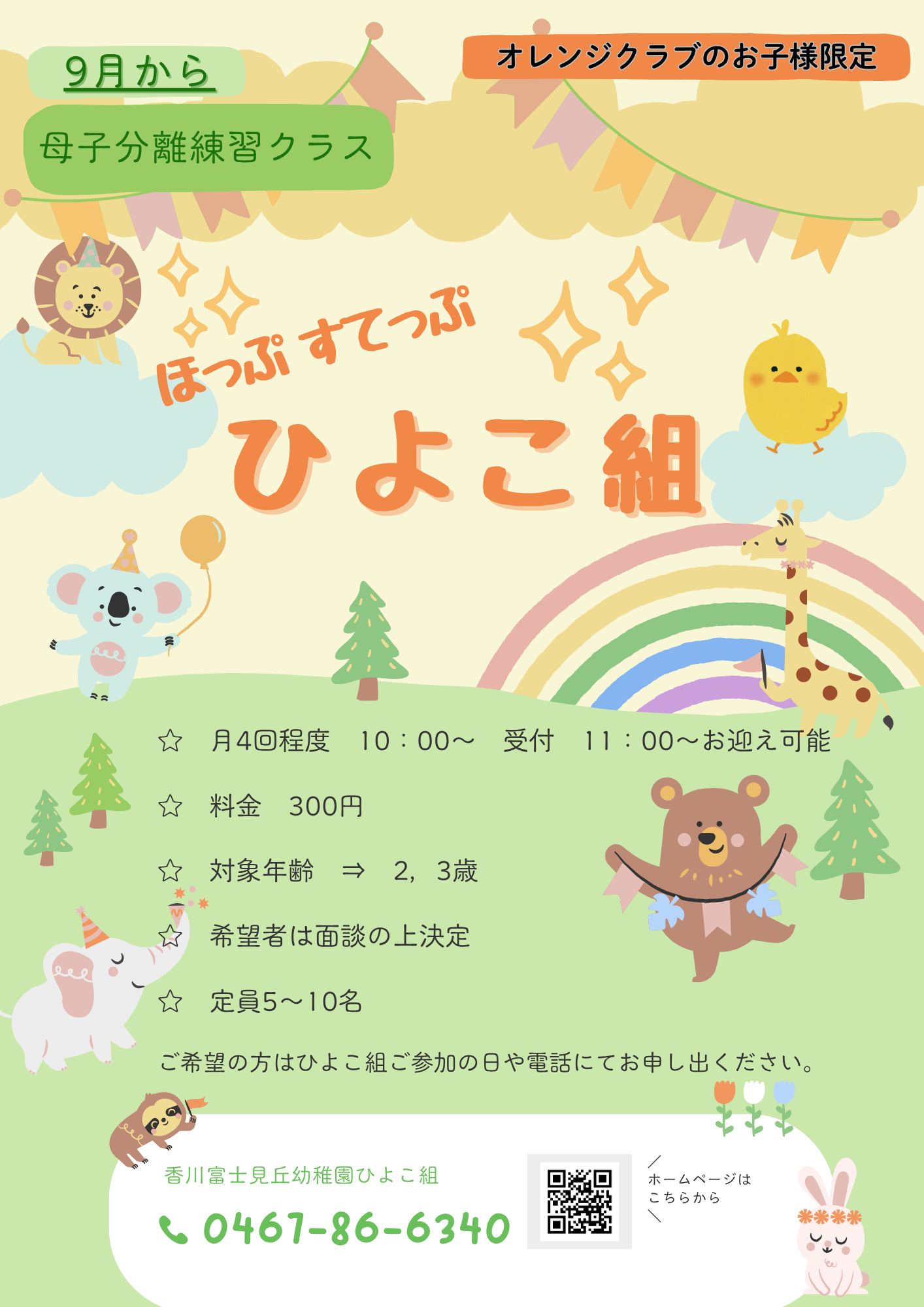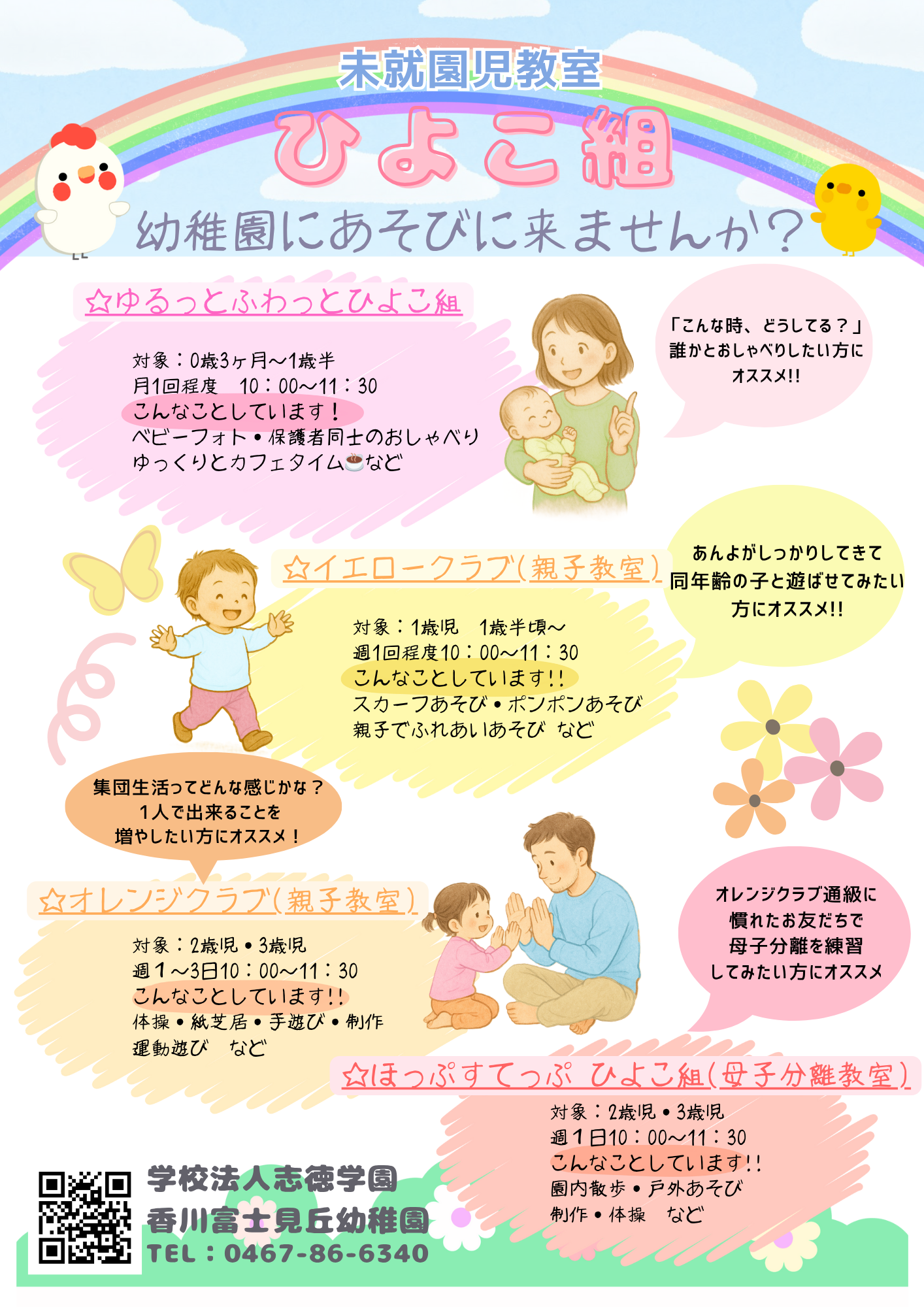 1歳〜3歳の就園前のお子様対象の体験教室「ひよこ組」もございます。詳しくはこちらをご覧ください。