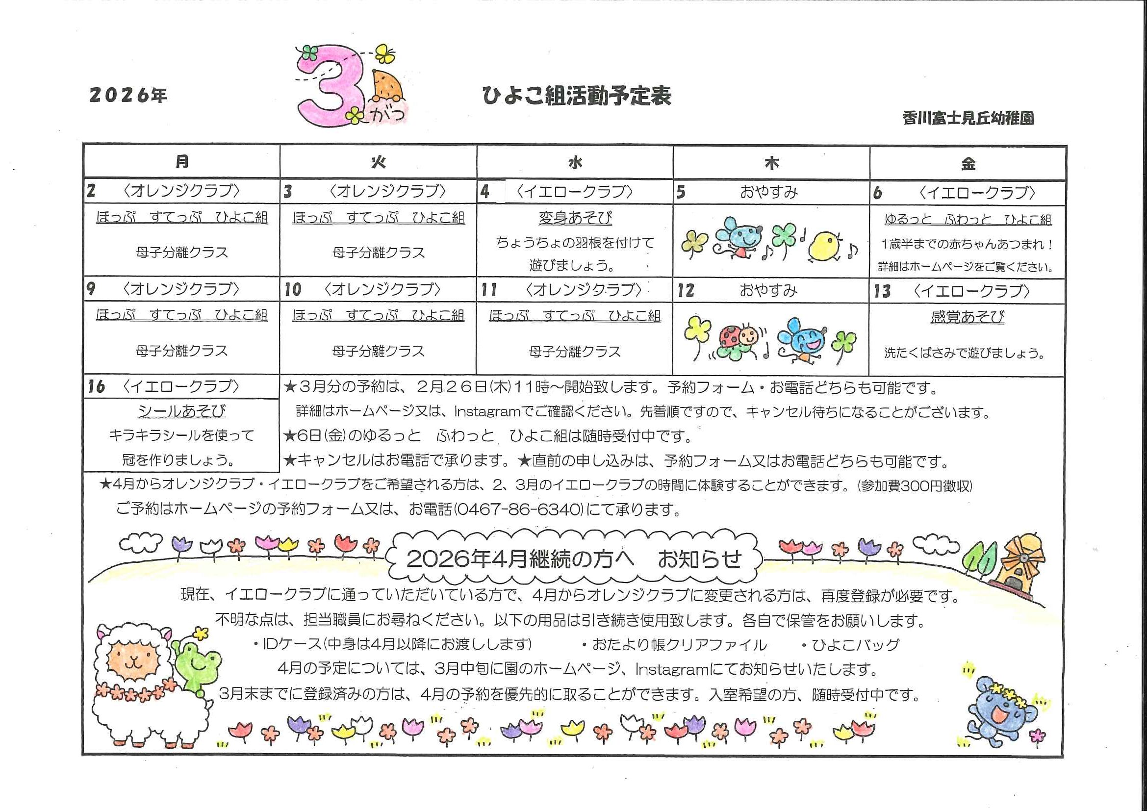 4月の予定については、3月中旬に園のホームページ、Instagramにてお知らせいたします。