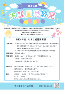 令和8年度入園説明会 〜園紹介ビデオ・説明会・園見学〜 令和8年9月10日(水)令和8年10月15日(水) いずれも(1)10時〜11時(2)13時〜14時の2部制 9月1日(月)10時から予約開始予約はこちらの申し込み […]